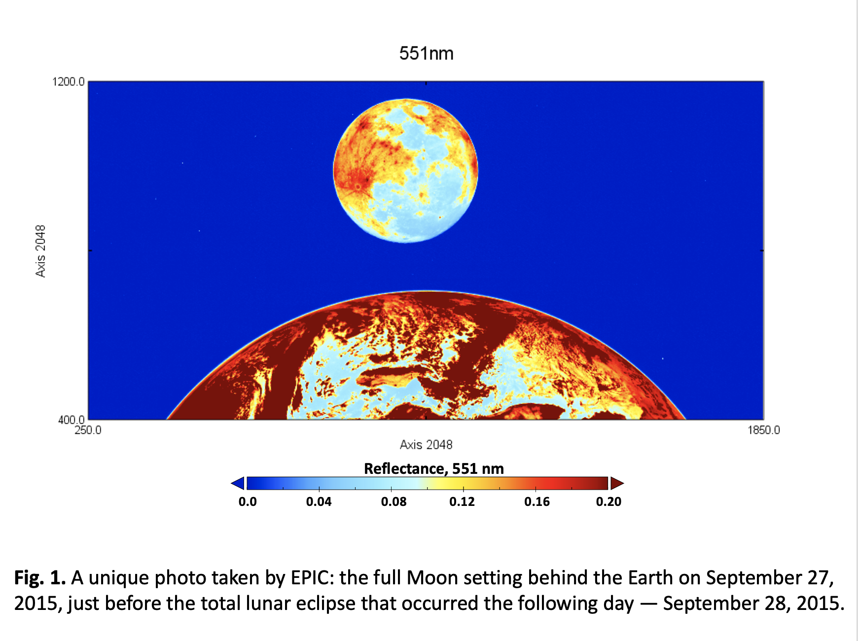 Figure 1. A unique photo taken by EPIC: the full Moon setting behind the Earth on September 27, 2015, just before the total lunar eclipse that occurred the following day — September 28, 2015.