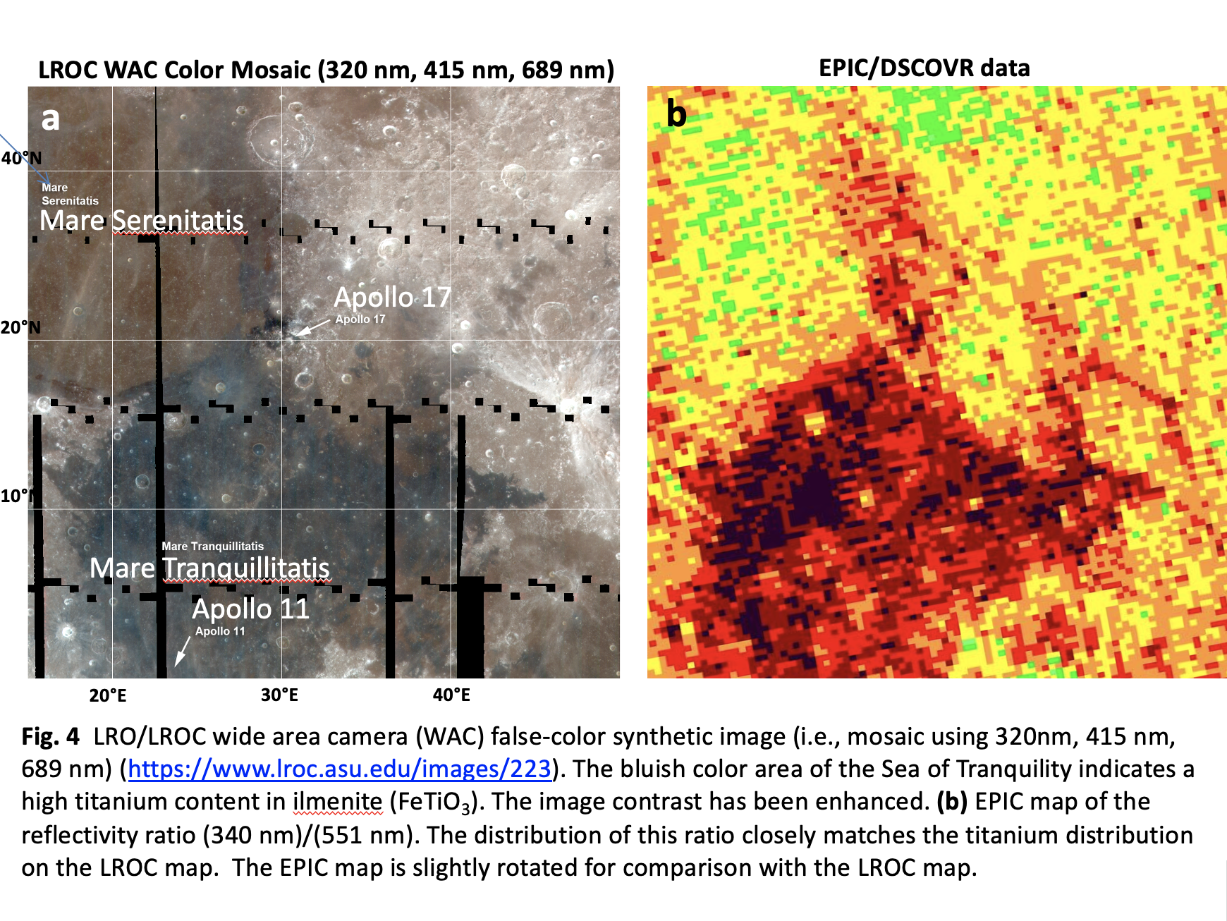 Figure 3. LRO/LROC wide area camera (WAC) false-color synthetic image (i.e., mosaic using 320nm, 415 nm, 689 nm) (https://www.lroc.asu.edu/images/223). The bluish color area of the Sea of Tranquility indicates a high titanium content in ilmenite (FeTiO3). The image contrast has been enhanced. (b) EPIC map of the reflectivity ratio (340 nm)/(551 nm). The distribution of this ratio closely matches the titanium distribution on the LROC map. The EPIC map is slightly rotated for comparison with the LROC map.